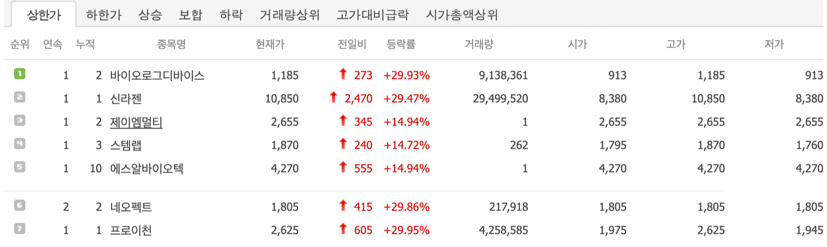 오늘도 이렇게 상한가 종목을 확인해보았습니다.