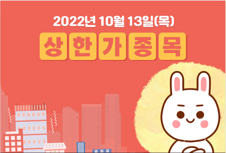 상한가 종목은 10월 13일(13시 기준) 아래와 같습니다.
