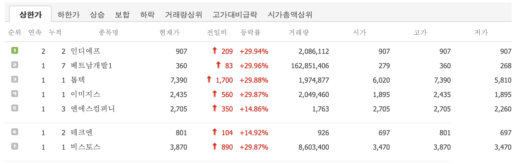 금일 상한가 종목은 인디에프, 베트남개발1, 톱택, 이미지스, 비스토스입니다.