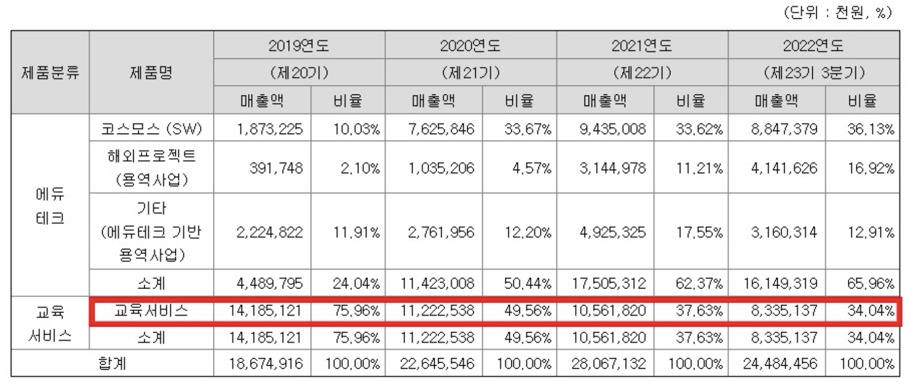 제품별 매출을 확인해보면 19년도에는 교육서비스 부분인 와우패스, 평생교육원 등 매출이 70% 넘게 차지하고 있습니다.