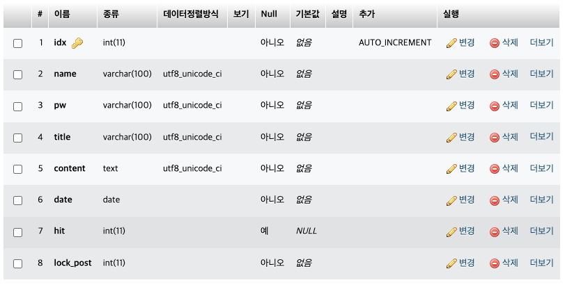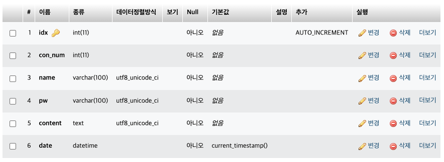 게시판 테이블의 경우 number를 기본키로 사용하였고, a.i기능을 사용하여 번호를 증가시키도록 하였습니다.