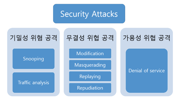 - 보안의 3가지 목표(기밀성,무결성,가용성)는 보안 공격에 위협받을 수 있다.