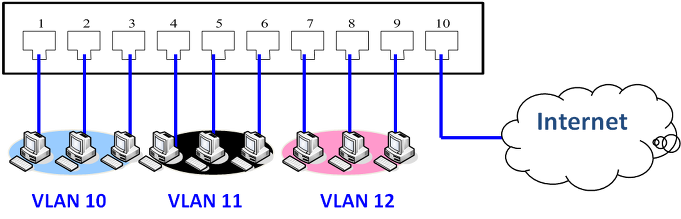 만약, 하나의 스위치에 포트가 1~10 까지 있다고 한다면 위의 그림처럼 물리적 네트워크를 VLAN으로 나눠 사용할 수 있다.