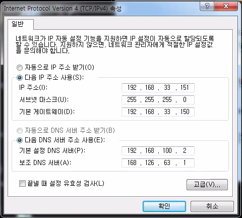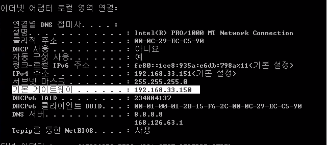 > cmd에서 ipconfig을 통해 네트워크를 확인하면, IP주소가 변경되었고 GW를 192.168.33.150으로 변경해야 한다.