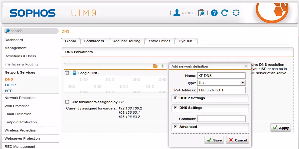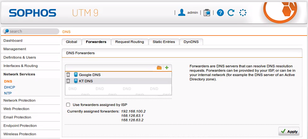 > Use forwarders assigned by ISP 체크 해제하고 + 눌러서 DNS를 별도 추가도 가능하다.