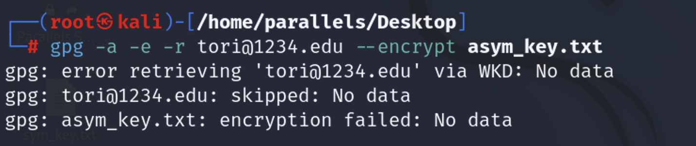 > gpg -a -e -r tori@1234.edu --import Desktop/tori.pub --encrypt asym_key.txt