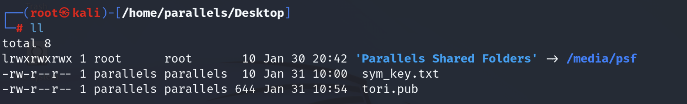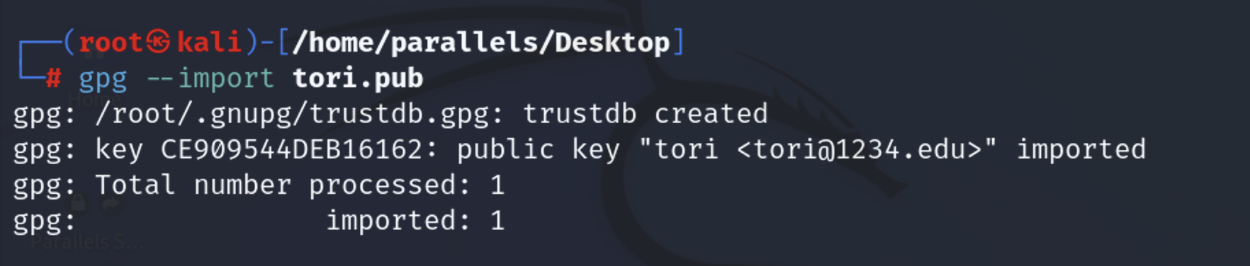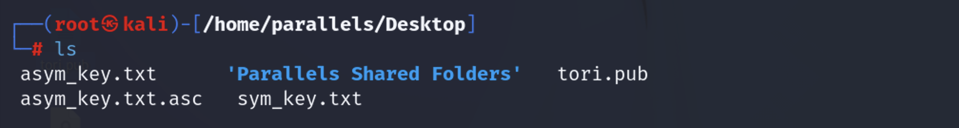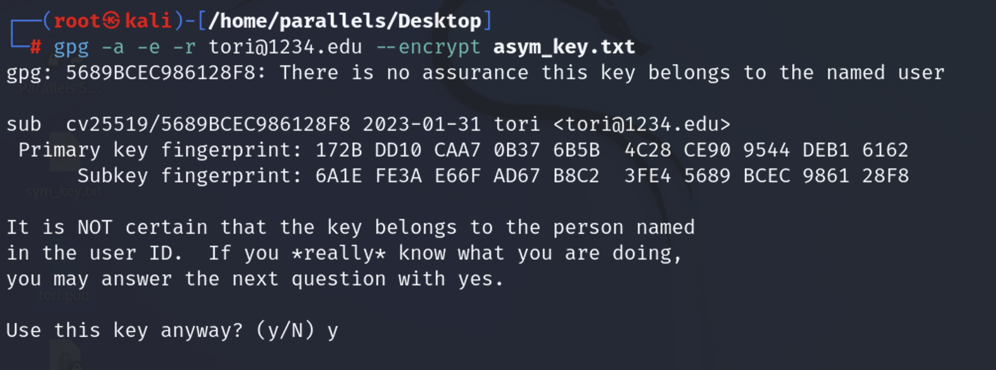 > gpg -a -e -r tori@1234.edu --import Desktop/tori.pub --encrypt asym_key.txt