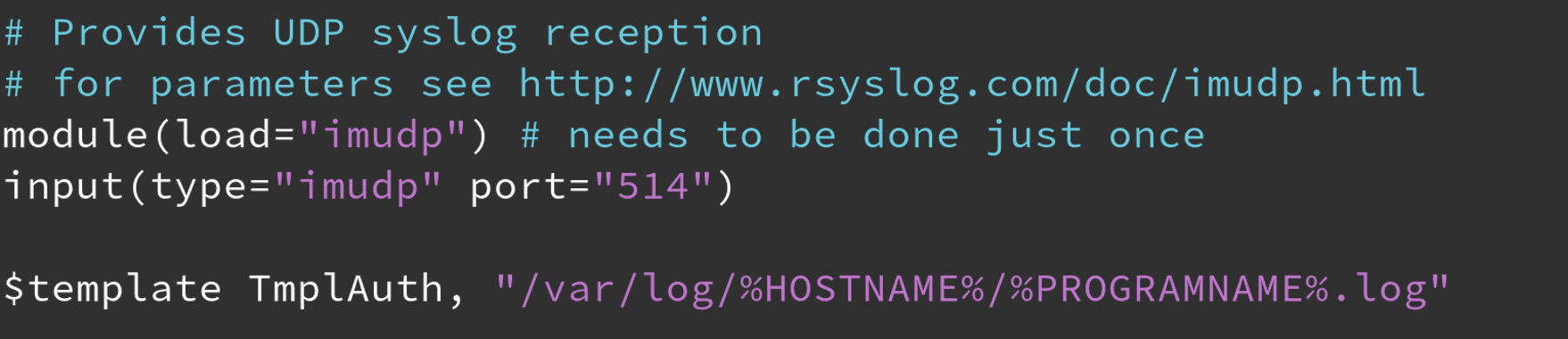 $template TmplAuth, "/var/log/%HOSTNAME%/%PROGRAMNAME%.log"