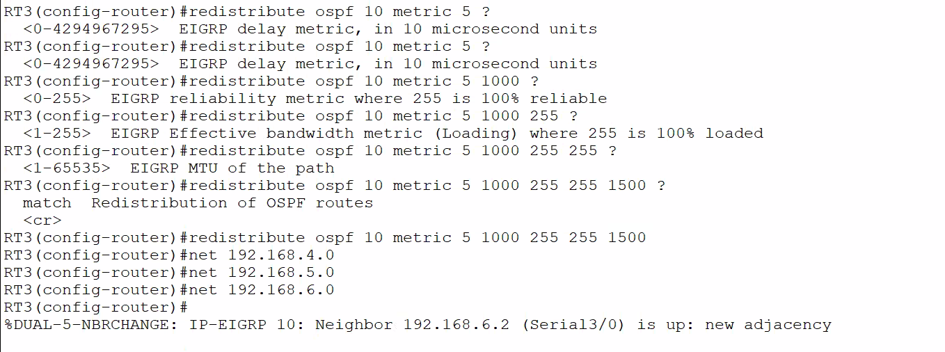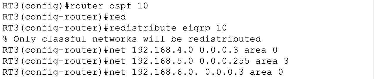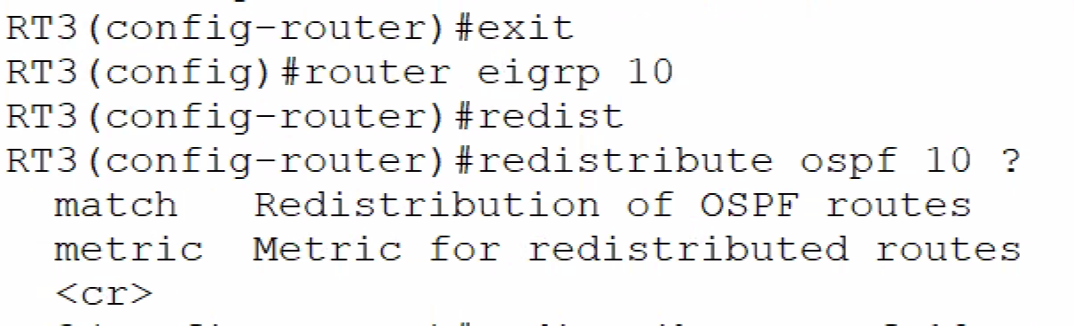 OSPF와 EIGRP가 혼재하는 네트워크에서 이 두 프로토콜이 만나는 지점이 RT3라면