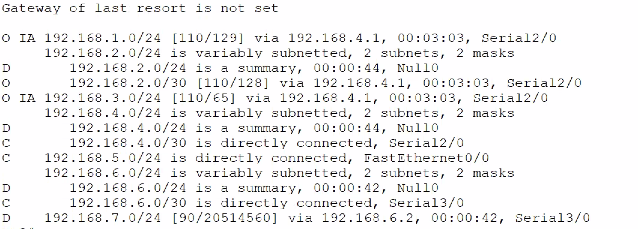 D - EIGRP, EX - EIGRP external, O - OSPF, IA - OSPF inter area N1 - OSPF NSSA external type 1, N2 - OSPF NSSA external type 2