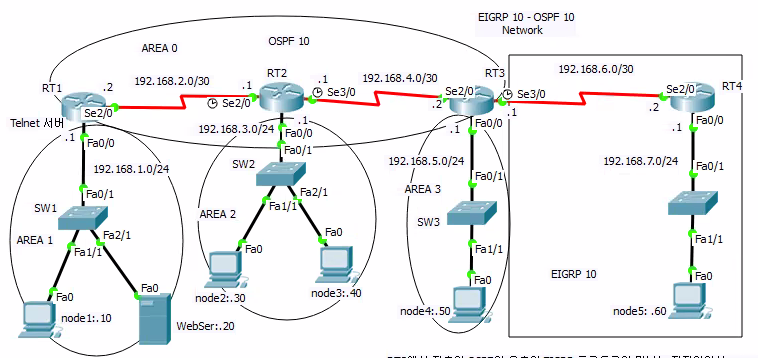 - 좌측의 OSPF와 우측 측의 EIGRP 프로토콜이 만나는 지점에서 서로 인식되도록 static과 Redistribute 방식으로 설정