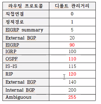 - 관리거리(Administrative Distance)는 하나의 네트워크에 여러 라우팅 프로토콜이 사용 되는 경우 라우터에서 이들 라우팅 프로토콜을 구별해서 최적의 경로를 선택할 때 참조된다. 라 우터는 각 라우팅 프로토콜을 이 관리거리로 인식하는데 경로의 관리거리는1~255 범위로써은 120, OSPF는는 110, EIGRP 90 등이다. 동일 경로에 대해서 두 가지 경로(관리거리가 다른 두 프로토콜)가 라우터에게 전해지면 라우터는 더 작은 값의 경로를 선택한다
