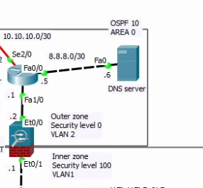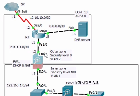 =>object network를 inside에 적용한다. object network는 특정 대역폭이나 서비스를 객체(object)로 만들어서 관리하는 기법으로써 dhcp = network setting, ospf = network setting, ...식으로 설정한 뒤 간단히 DHCP, ospf로 적용시킬 수 있다. 단축키나 가상의