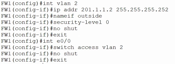 > Route out side 0.0.0.0 0.0.0.0. 201.1.1.1(방화벽에서 봤을 때 외부에 있는 아이피를 써주거나 Et0/0으로 써서 설정한다.)