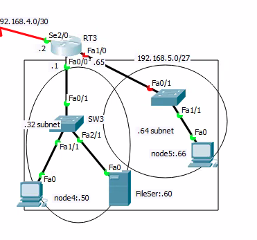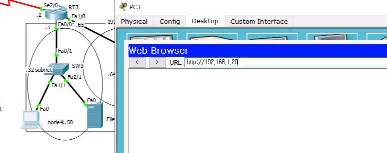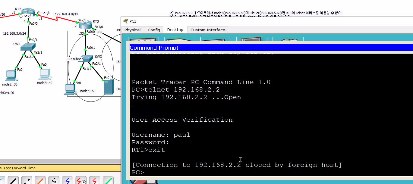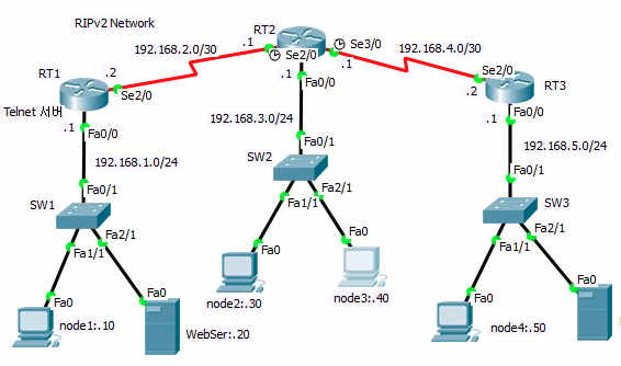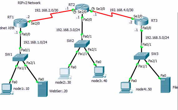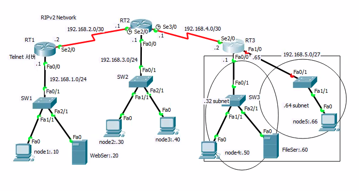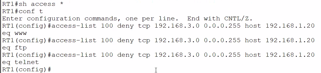 - 192.168.3.0 네트워크의 노드들은 192.168.1.20 웹 서버의 서비스(FTP,WWW)를 이용하지 못하고 라우터(RT1)Telnet 도 불가