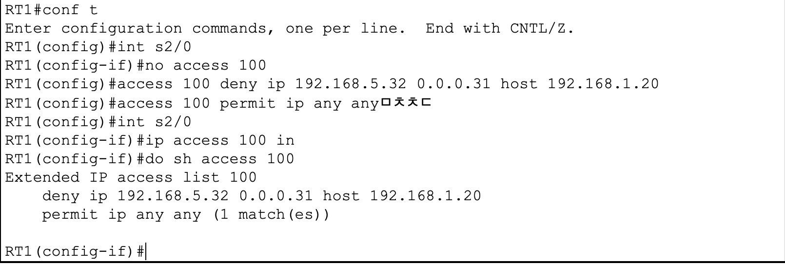 [+] 라우터 (RT1)에서 접근제어 목록 생성/적용(line vty 0 4)