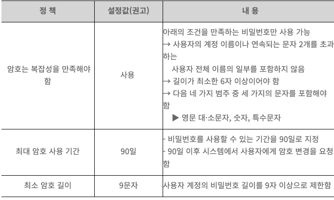 - 사용자를 추가할 경우 복잡성, 길이, 사용 기간 등 설정 가능