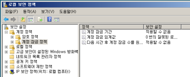 - 계정 잠금 정책에 의해 3번 이상 틀린 계정은 접속할 수 없다.(디폴트값 30분)