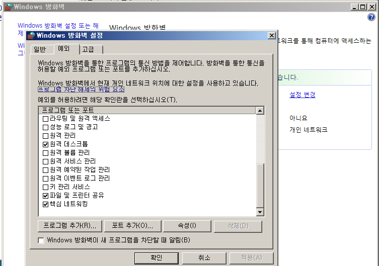 - windows 방화벽을 통해 프로그램 설정-> 예외