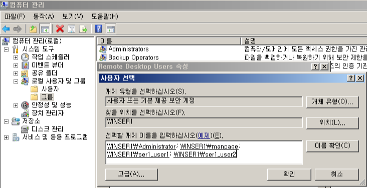 - 컴퓨터 관리 - 로컬 사용자 및 그룹 - 그룹 - Remote Desktop Users
