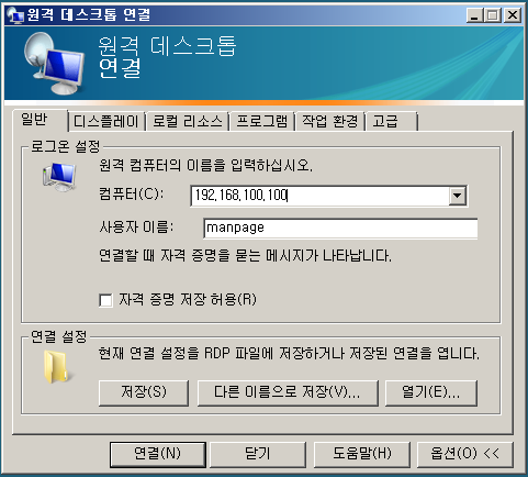 - 시작 - 모든->보조-원격데스크톱 연결 or mstsc