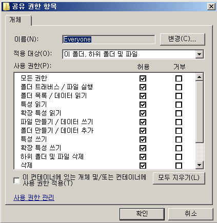 - 기본 보안 설정은 Everyone그룹에 대해 모든 권한 허용이다.