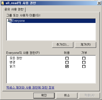 =>설정은 해당 폴더의 속성 창에서 -> 고급 공유로 가서 -> 권한으로 가서 -> 공유 탭에서 설정