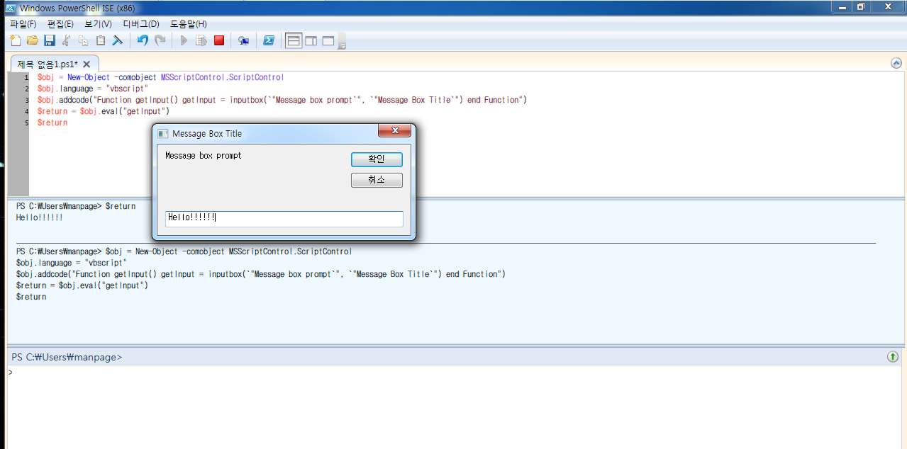 $obj.language = "vbscript" $obj.addcode("Function getInput() getInput = inputbox(`"Message box prompt`", `"Message Box Title`") end Function")