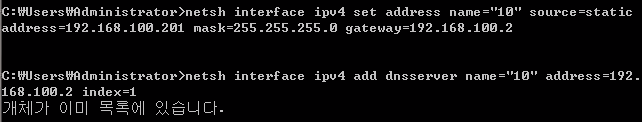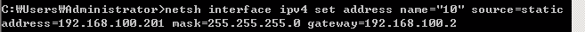 > netsh interface ipv4 set address name="10" sourec=static address=[IP] mask[255.255.255.0] gateway=[192.168.100.2]