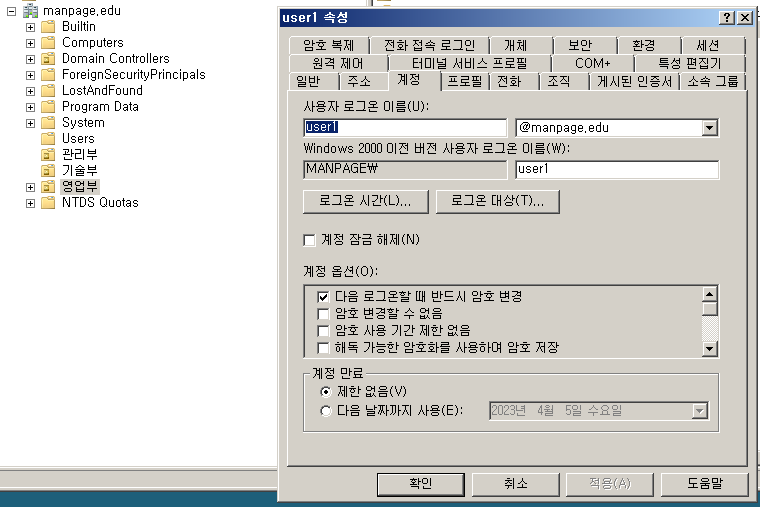 - 사용자를 만드는 방법은 같으나, 다음 로그온할 때 반드시 암호 변경" 을 선택해준다.
