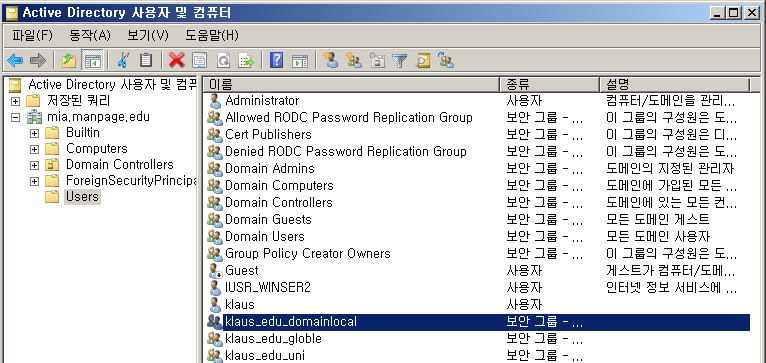 <= 자원과 그룹, 사용자 문제가 있을 때 급하게 편하게 처리하느라고 이들을 글로벌 그룹으로 만들어 두는 경우가 있는데 반드시 나중에 제대로 조절해 두어야 한다!!! 신중히 생성하고 사용되어져야 한다.