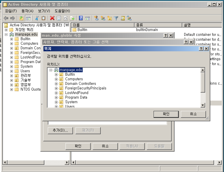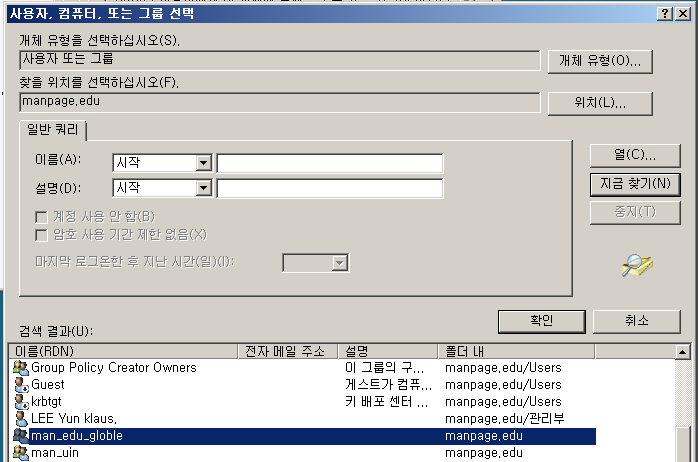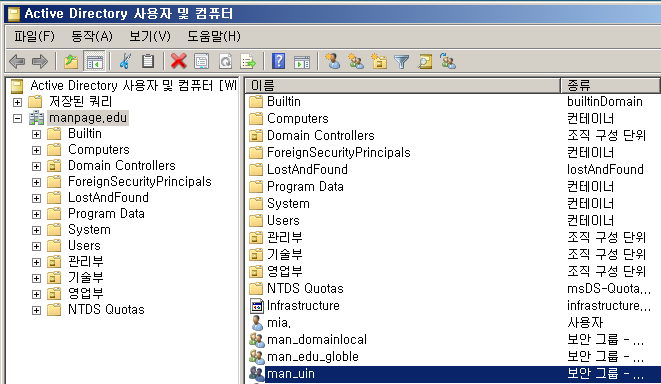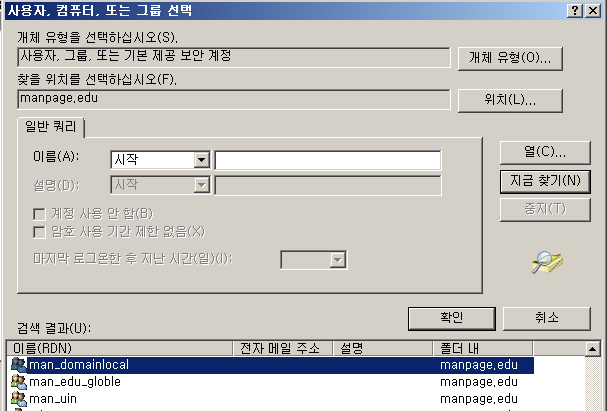 > 자원 : 해당 도메인(manpage.edu) 로컬 그룹을 생성한 도메인의 자원(manpage.edu) 이용