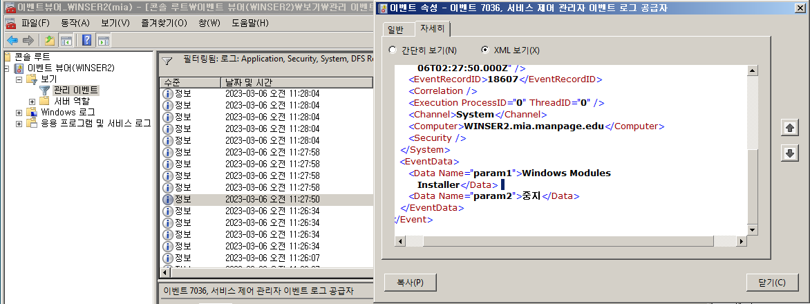 - WINSER1(manpage)서버에서 WINSER2(mia)서버의 이벤트 뷰어를 확인할 수 있다.