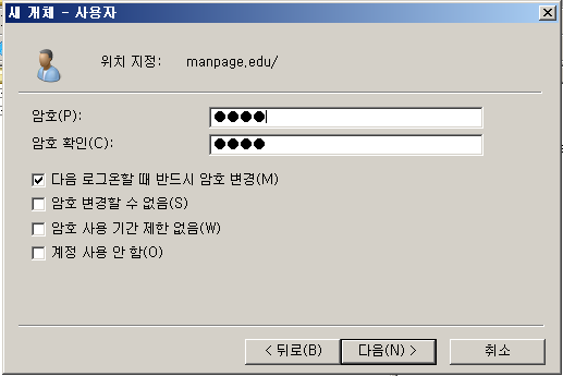 - 사용자를 만드는 방법은 같으나, 다음 로그온할 때 반드시 암호 변경" 을 선택해준다.
