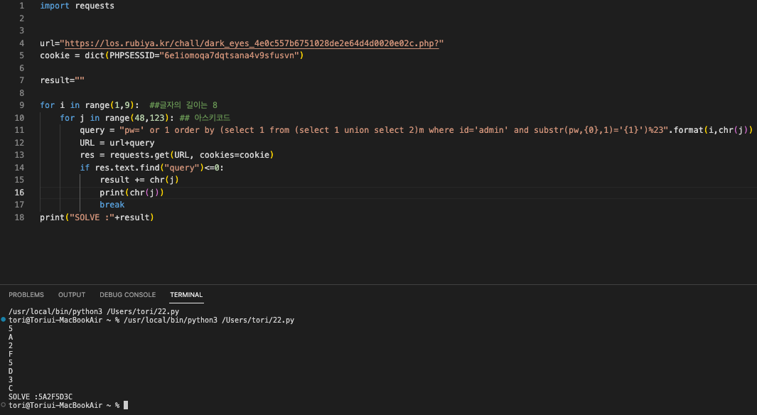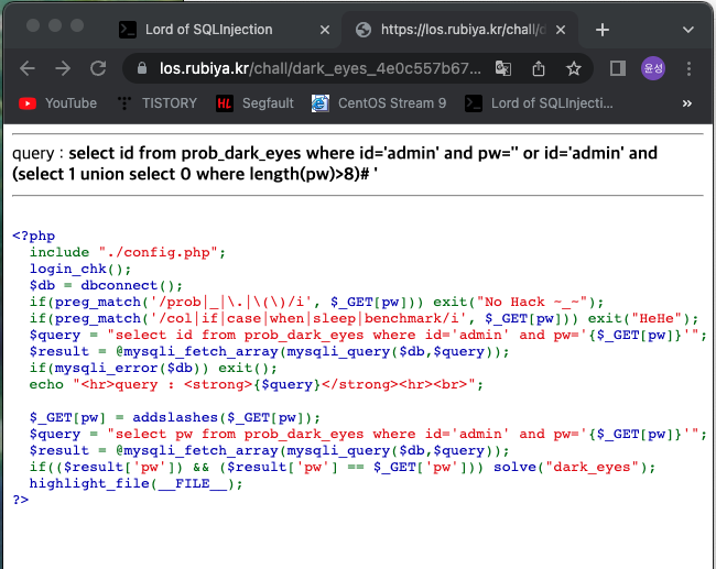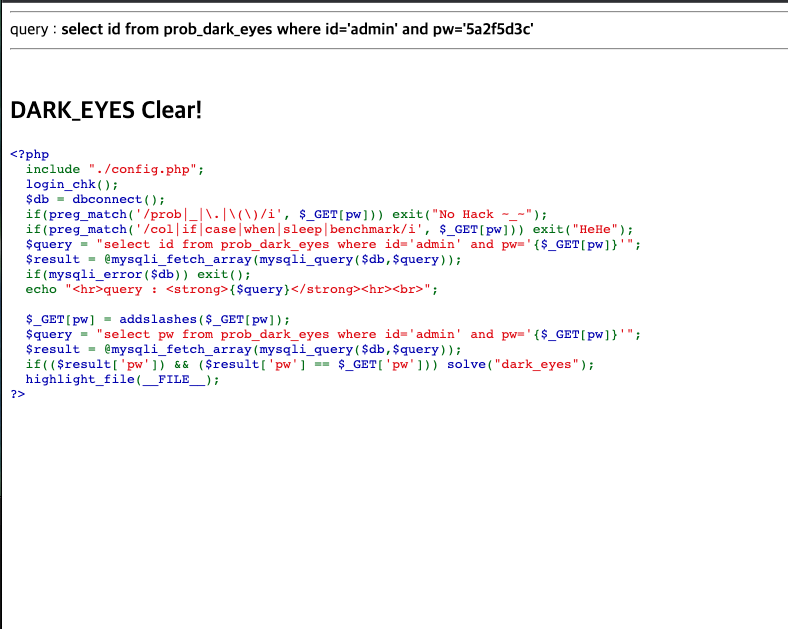 if(($result['pw']) && ($result['pw'] == $_GET['pw'])) solve("dark_eyes");