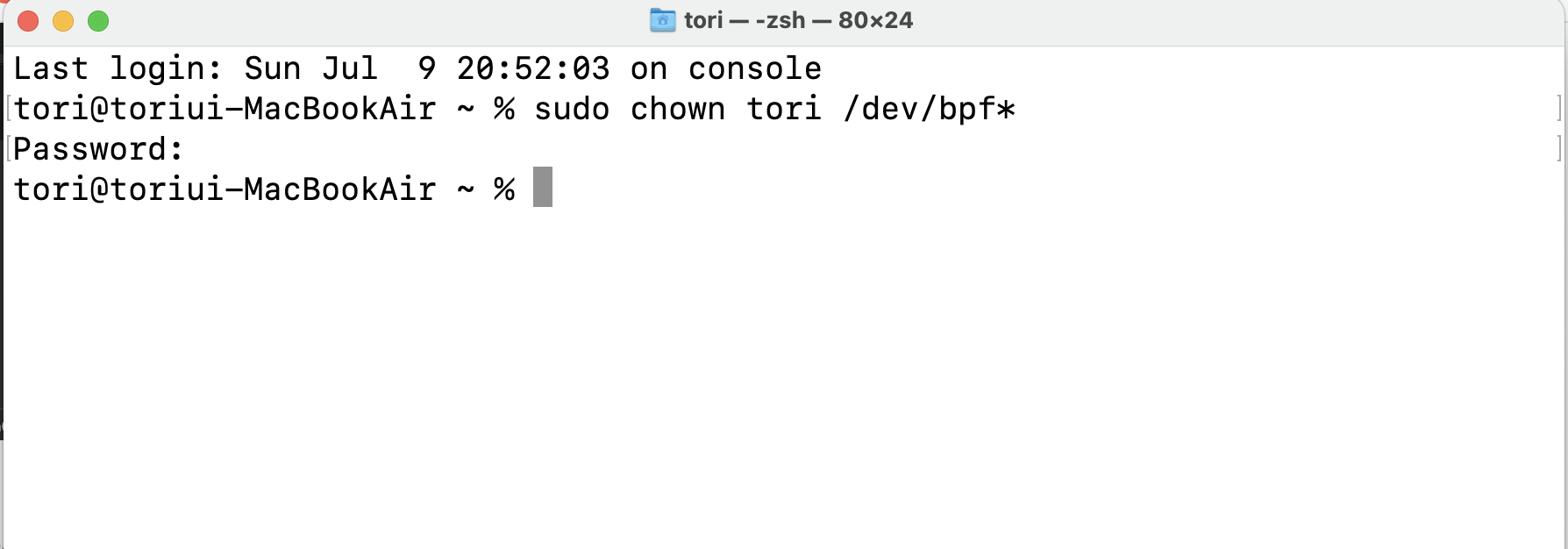 ==> sudo 권한으로 chown 명령어를 사용하여 [사용자]에게 /dev/bpf* 사용할 수 있는 권한을 부여