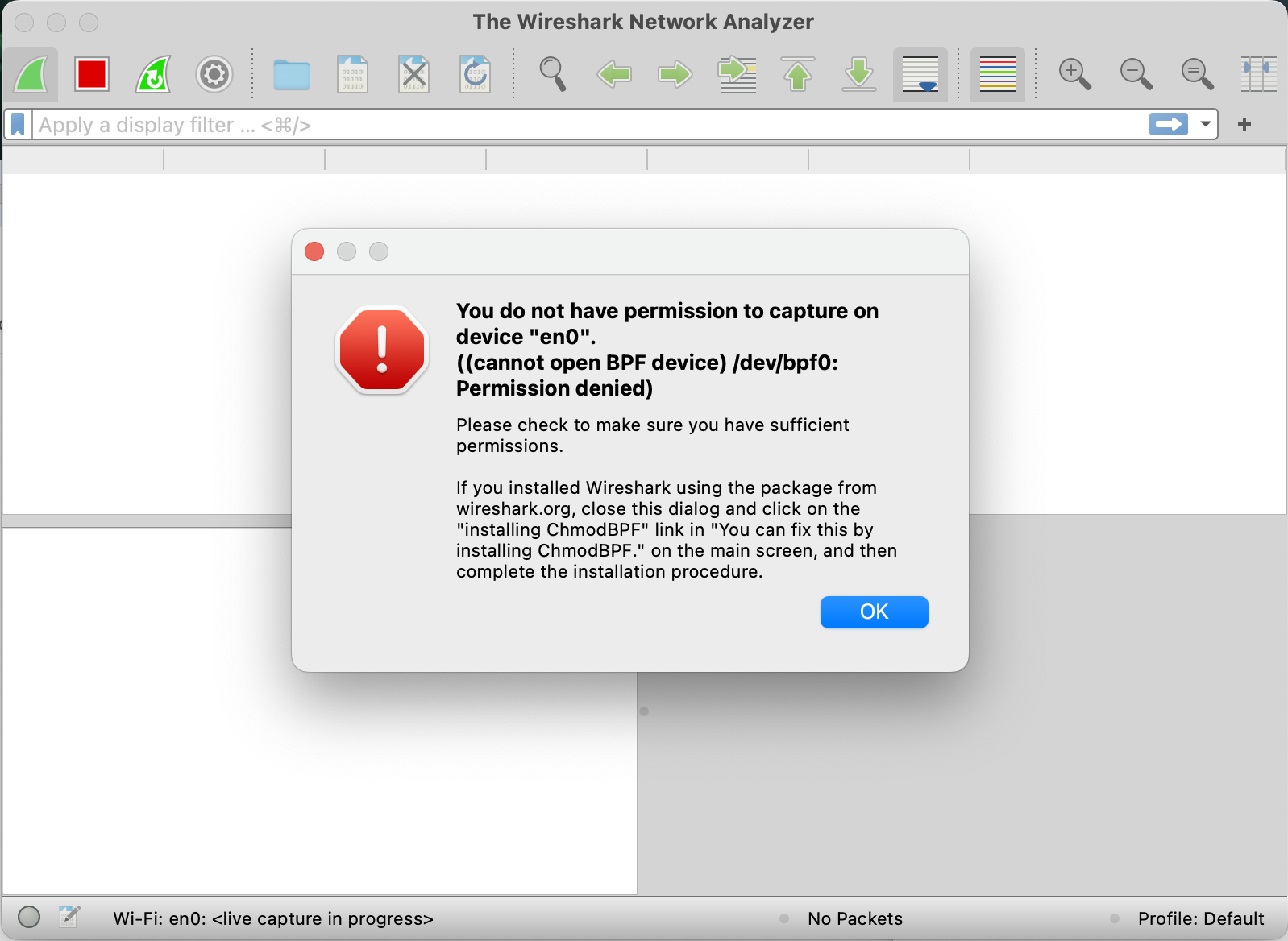 The capture session could not be initiated on interface 'en0'(You don't have permission to capture on that device)