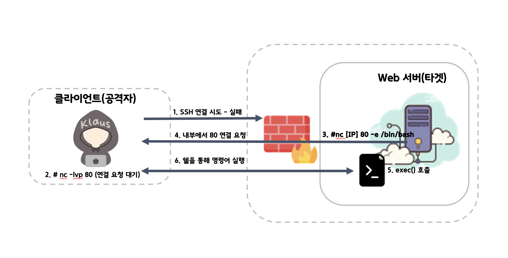 - 리버스 쉘 (타겟 서버가 클라이언트(공)로 접속해서 클라이언트가 타겟 서버의 쉘을 획득) ==> 내부에서 외부로 연결하기 때문에 방화벽 우회