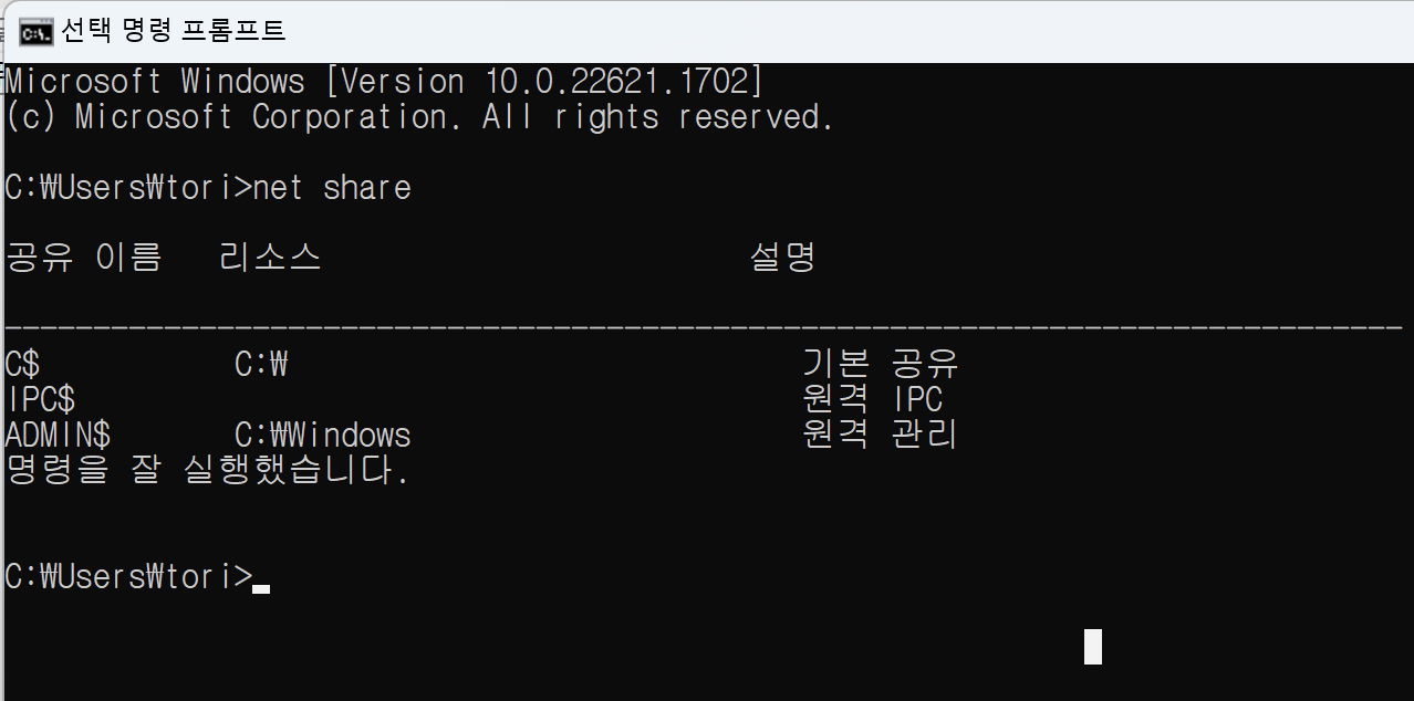 - net share 공유이름 / delete ==> 재시작되면 다시 자동으로 기본 공유 폴더 생성