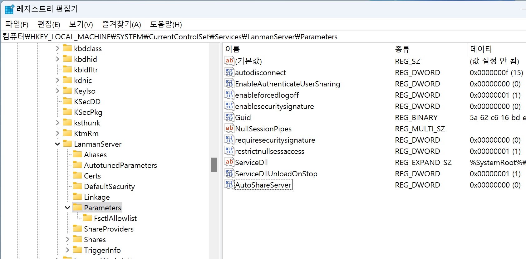 > HKLM SYSTEM CurrentControlSetlservices LanmanServerlparameters)에서 DWORD를 "AutoShareserver"로 새로 만들어 0으로 설정 (win NT일 경우 : AutoShareWks)