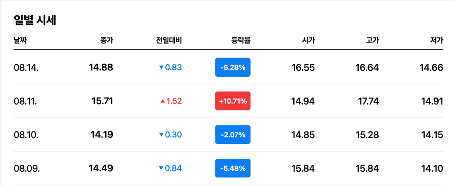 - 실적발표 이후 5.21%하락한 13.45달러에 거래가 되었고, 추후 회복하여 20%를 육박한 17.74 달러를 기록하였습니다.