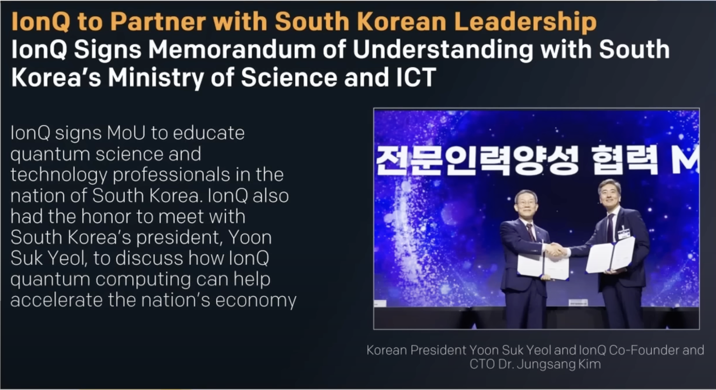 - 윤설역 대통령과 만나 아이온큐의 양자컴퓨팅이 한국 경제를 가속화하는데 도움이 될 수 있는지 논의