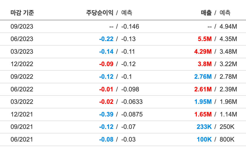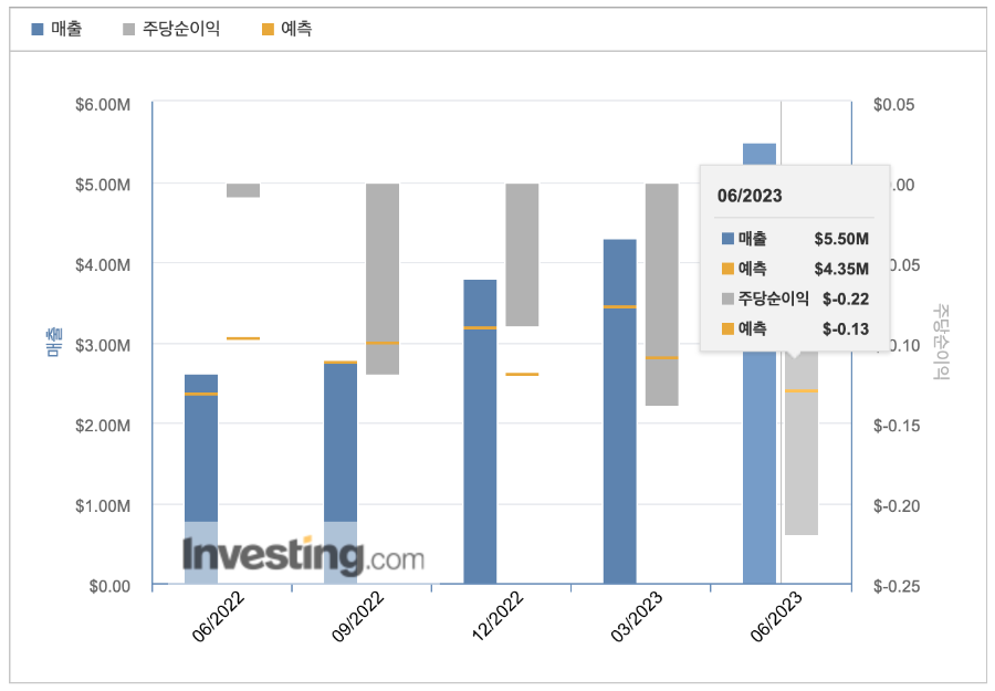 -23년 3분기 예상 매출은 480만 ~520만 달러로 예상되고 있으며, 인베스팅닷컴에서 확인하는 것처럼 보수적으로 예측