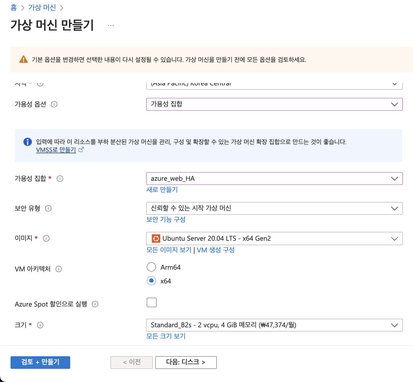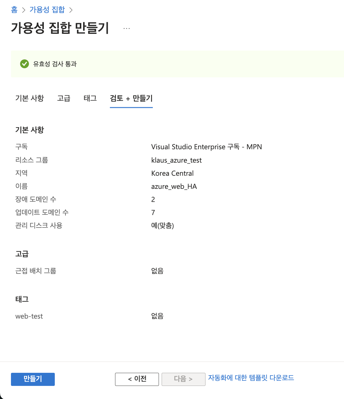 - [가용성 집합 생성] and [가상 머신 만들기]-> [가용성 옵션] 선택하여 가용성 집합 선택