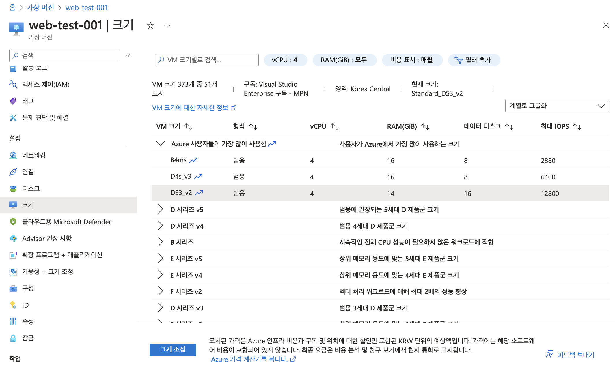 - [가상 머신] -> [크기]에서 원하는 크기를 선택하여 [크기 조정]