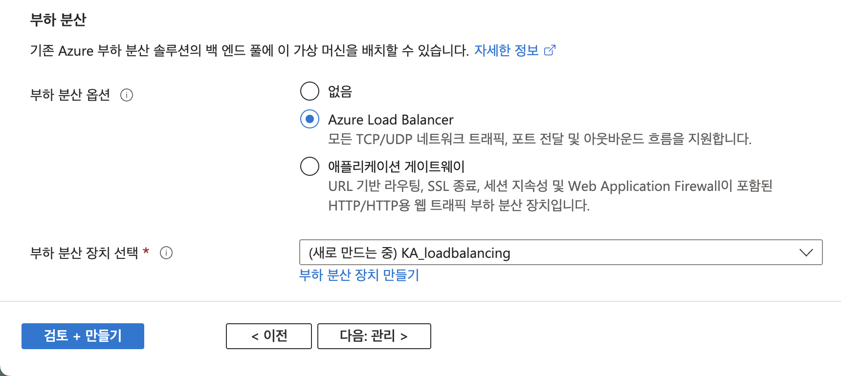 - 부하 분산을 사용할 VM생성 시 네트워킹에서 로드밸런싱을 선택