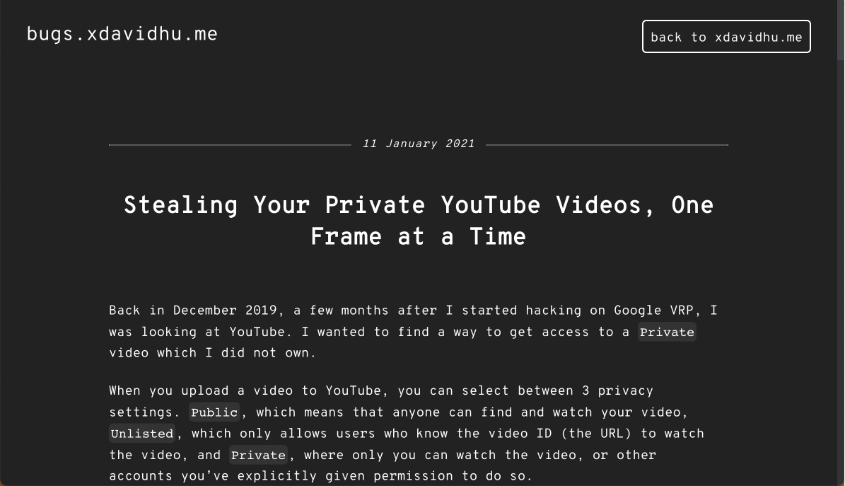 - YouTube의 비공개 동영상에서 프레임을 가져올 수 있는 IDOR (Insecure Direct Object Reference)
