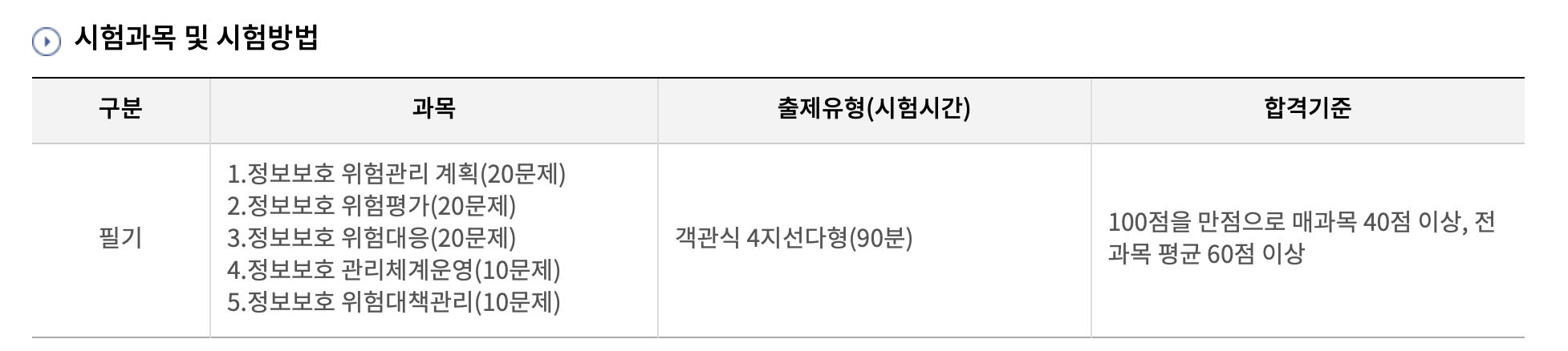 기존 정보보안기사 5과목(정보보호 관리 및 법규) 내용을 실무 관점에서 따로 떼어낸 듯한 시험으로 보인다.