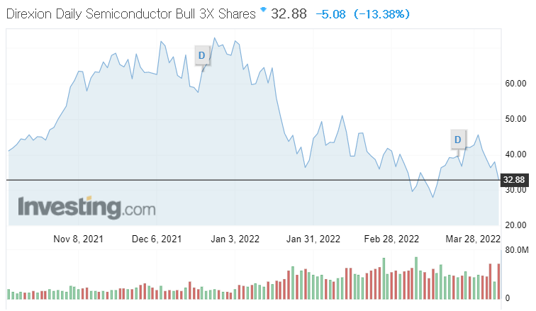 인덱스 지수인 필라델피아 반도체 지수 추종 ETF의 3배 레버리지 상품인 SOXL이다.