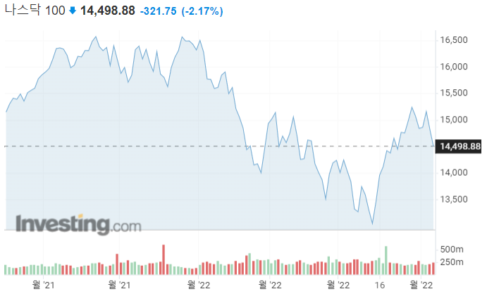 나스닥은 금일(04/07) 기준 많이 하락을 한 상태이다. 2%가량 하락한 상태이며, 오전에 국내 실시간 검색어